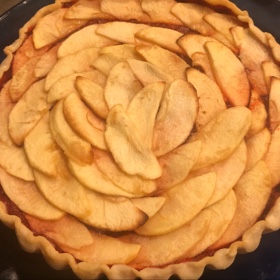 Lay the slices out on the tart, starting from the outside working in, in a swirl pattern.