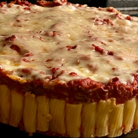 Let rest about 10-15 minutes before serving. Use a thin knife to separate pasta and cheese from the sides, being careful not to scratch your pan.