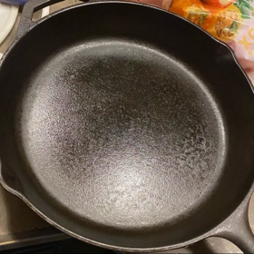 When you are ready, put oil in the pan and heat it up on medium low. Put your eggs in a bowl. Add a pat of butter to the pan and spread it around to melt. Pour the eggs out of the bowl into the butter and cook as desired. When you go to move the eggs, they should slide out easily. If they stick, you need to season the pan a few more times before trying again. Eventually, the surface should allow the eggs to slide easily around the pan.