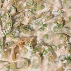 Pour remaining Alfredo sauce over the shells and sprinkle with Mozzarella.