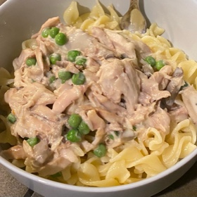 Stir in peas and chicken and cook until the chicken is warmed through and the sauce is desired consistency.
