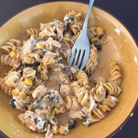 While pasta is cooking, combine sour cream, salsa, taco seasoning, cumin, garlic powder, and onion powder in a large mixing bowl.