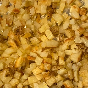Wash and dice your potatoes. Put in a bowl of cold water as you work. Drain and rinse.