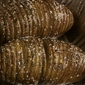 Cut slits in the potatoes, leaving the bottom intact. Space the slices 1/8-inch to 1/4-inch apart. To prevent cutting all the way through, set your potato between two dowels or something similar, on a surface that will prevent rolling or sliding, like a clean towel. If you cut all the way through on accident, put the potato in a piece of foil.