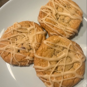 Make the icing: In a small saucepan over low heat, melt the butter and maple syrup together, whisking occasionally. Once the butter has melted, whisk in the confectioners sugar. Once it is completely incorporated remove from the heat. Drizzle over the cookies quickly, before it starts to harden.