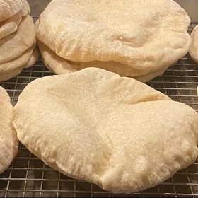 Lay the two pitas on the stone in the oven and cook 5 minutes. While they are cooking, roll out the next two pitas and let them rest. Work your way through all of them in this manner.