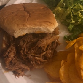 Put the meat back in the crockpot and stir in some BBQ sauce, if desired, and the reserved liquid. Adjust as desired. Put the crock pot on high or low, depending on how soon you want to eat, until the meat is heated back through.