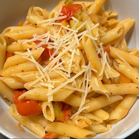 Cook your pasta about 2 minutes less than what it calls for on the package. Add a ladle or two of pasta water to the vegetables. Drain the pasta and add to the vegetables. Cook together until the pasta is done. Adjust salt and pepper as needed. If desired, add a drizzle of olive oil.