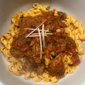 Two, my preferred method, drain the pasta and return it to the pot. Pour in just enough white sauce to coat. Serve pasta and spoon bolognese over the top. I prefer this method because of how rich this bolognese is. You don't really need very much of it on your pasta.