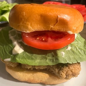 To serve, spread each side of a roll with the mayo, place on the chicken, and top with desired toppings. Set out the seasoning shaker for anyone who'd like to sprinkle on more.