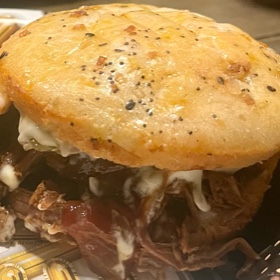 Shred beef and return it and the onions to the slow cooker. Mix just enough liquid back in to cover and moisten the meat.
