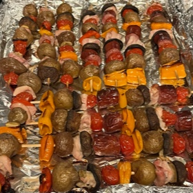 Alternate the items on your skewers, leaving about an inch at the top and bottom to hold. Lay skewers on lightly oiled foil lined trays and oil them. Fill the trays up without overcrowding (about 12 per tray). If you have more than will fit, prep and bake them on another tray while your first batch is baking, then bake them when the others are done. If you try to cram them all in, your skewers won't cook as desired.
