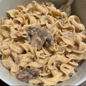 Add your onions and mushrooms to the pan. Sauté until onions are translucent and the mushrooms are cooked.