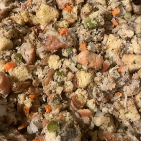 Three to four days before you plan to make the stuffing, cut the bread, and cornbread if you have it, into bite sized cubes and lay out on a baking sheet.