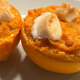 Fill each orange cup with sweet potatoes and top with several mini marshmallows or large marshmallows cut into pieces. Put them in a baking dish.