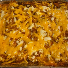 End with dipped tortillas and spread any remaining enchilada sauce over the top. Top with cheese.
