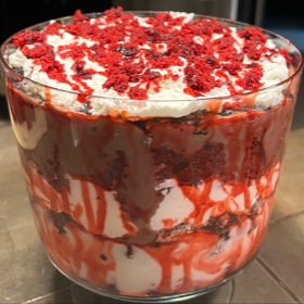 Drizzle some of the blood around inside the trifle dish. Layer in some cake, vanilla pudding, Oreos, then whipped cream. Layer in more cake, chocolate pudding, Oreos, and whipped cream. Repeat this process until you’ve filled your dish(es) most of the way.