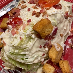 Drizzle creamy blue cheese dressing (or desired dressing) on top of each lettuce wedge then top each wedge with your toppings.
